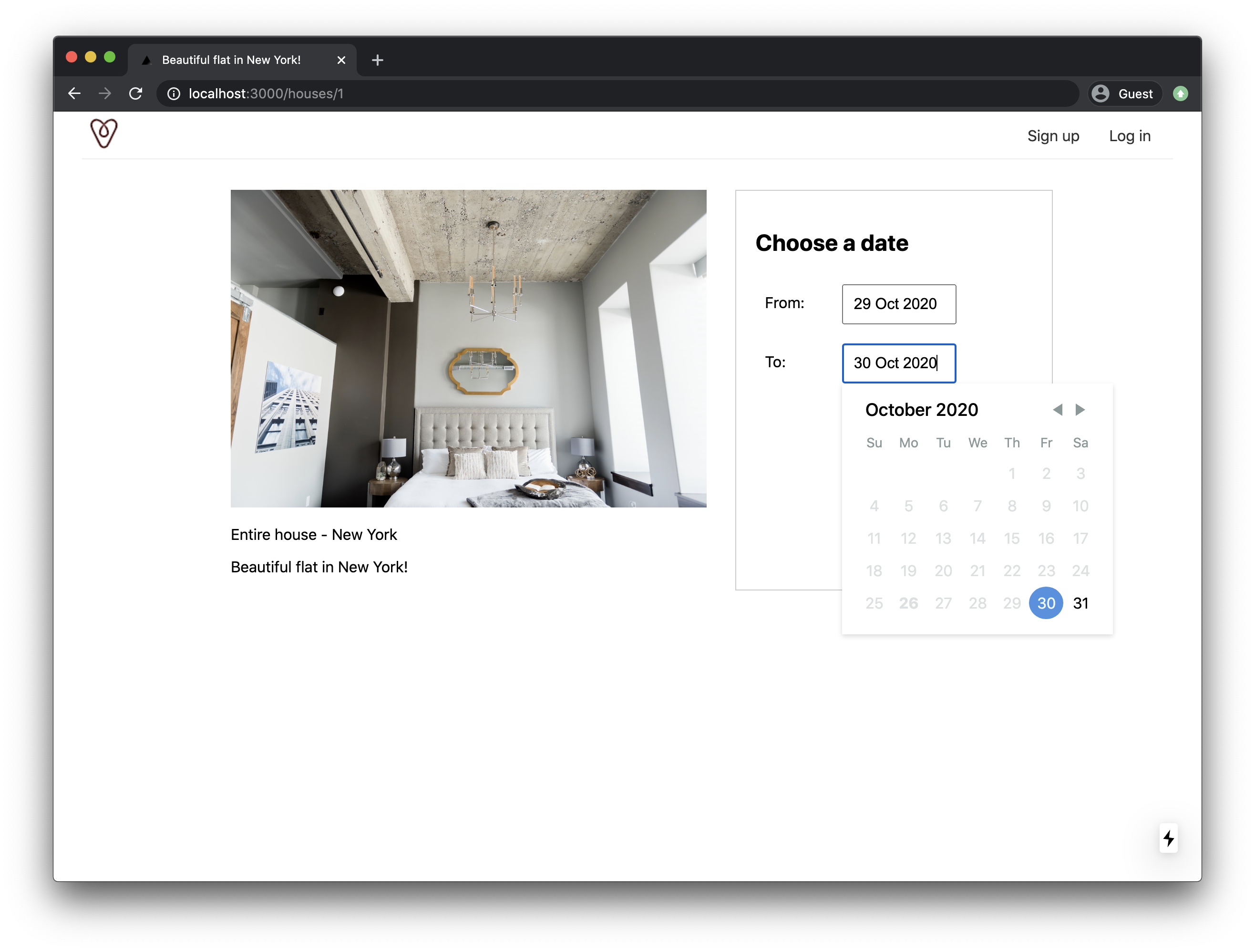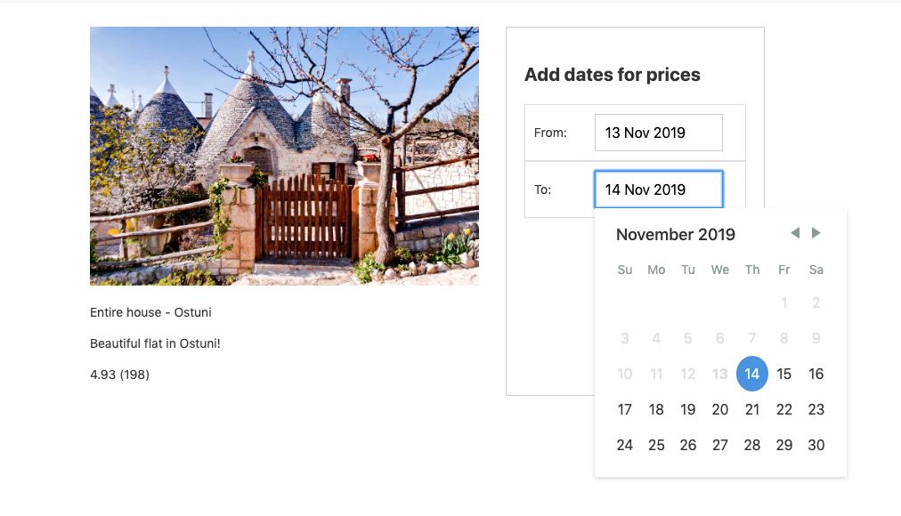 Now we can select a start and end date to book a place (something we’ll implement later!) but we have one thing to do: start and end dates are not synced!